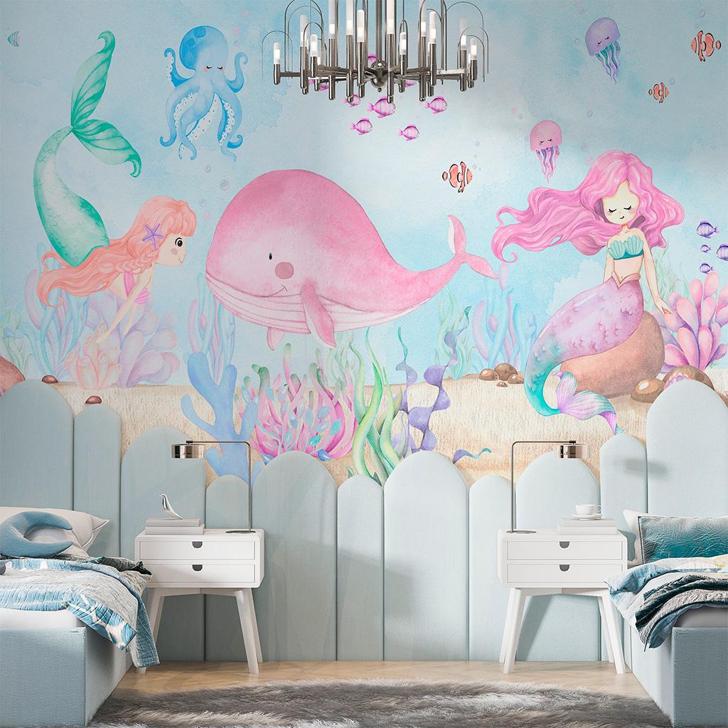 Papel de Parede Personalizado Infantil Aquarela Sereia Rosa Fundo do Mar